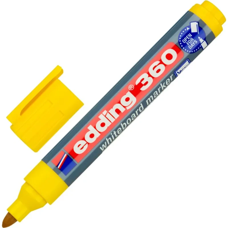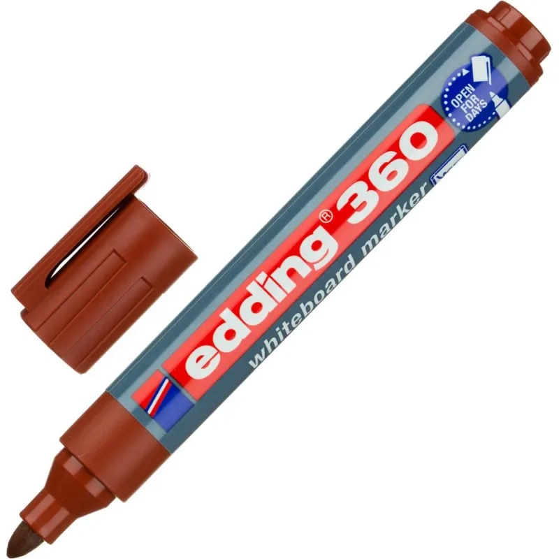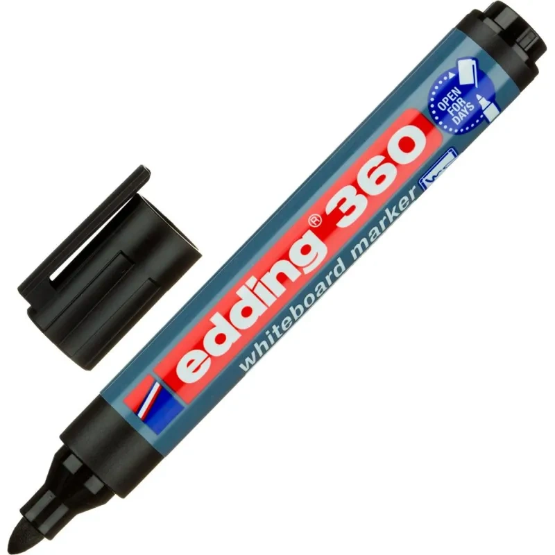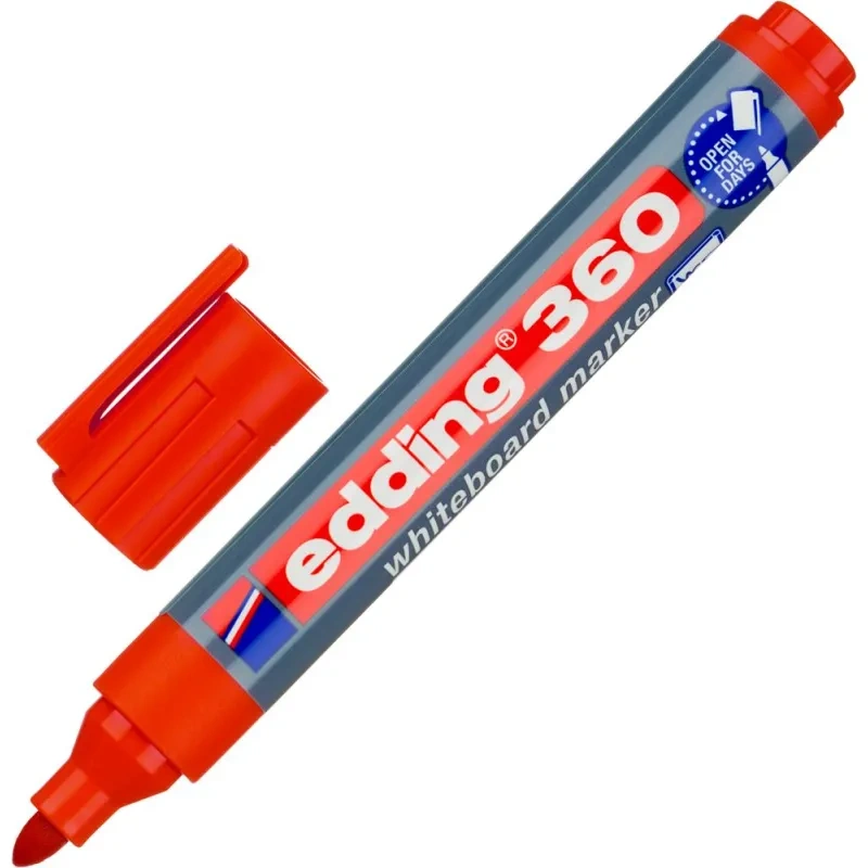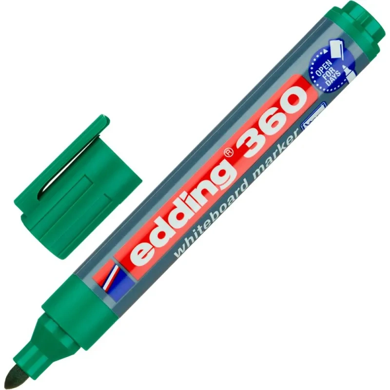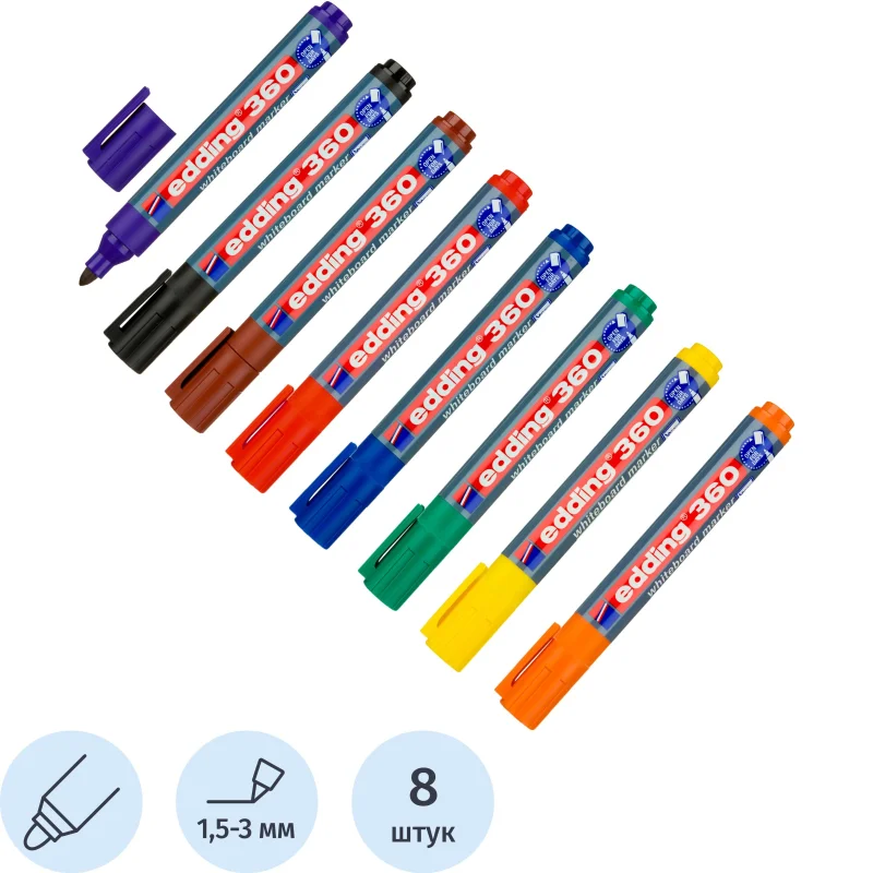 Набор маркеров для досок Edding 360 с технологией «cap off» 8 цветов. Данные маркеры можно использовать на магнитно—маркерных досках, а также на флипчартах. Круглый наконечник. Пластиковый корпус. Толщина линии письма: 1.5–3 мм. Стирается сухой губкой. Упаковка: ПВХ-конверт . Размеры маркера: диаметр 16 мм, длина 137 мм.
