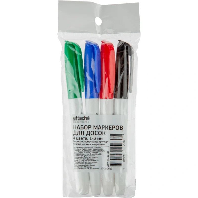 Набор маркеров для досок Выбор есть (Attache Economy) с круглым наконечником в пластиковом корпусе. Толщина линии письма 1-3 мм, в зависимости от силы нажатия на маркер и угла нанесения линия. Цвет чернил: чёрный, синий, красный, зелёный. Стираются сухой губкой. Маркеры предназначены для письма на белых эмалевых досках. Стираются cухим способом почти со всех гладких поверхностй, таких как эмаль, стекло, пластик. Чернила на спиртовой основе.
