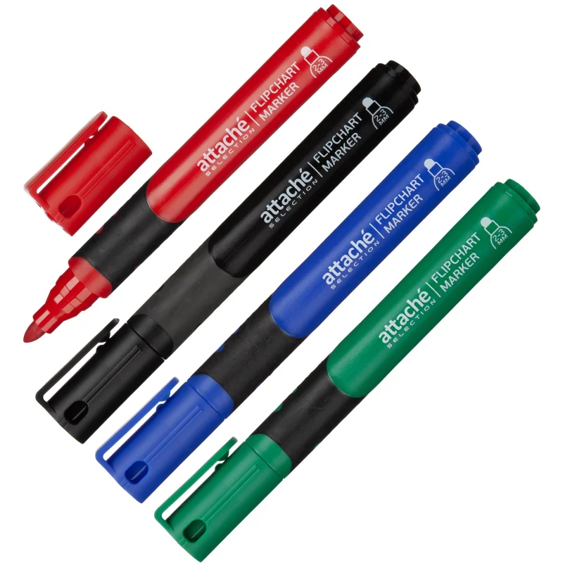 Набор маркеров для флипчартов по бумаге Attache Selection набор 4 цв 2-3 мм Набор маркеров для бумажных флипчартов Attache Selection состоит из 4-х маркеров черного, синего, красного и зеленого цветов. Маркеры заполнены чернилами на водной основе. Чернила обладают насыщенным цветом и позволяют создавать надписи, не просачивающиеся сквозь бумагу. Смываются водой с большинства поверхностей. Круглый наконечник позволяет проводить линии толщиной 2-3 мм. Снятый колпачок не потеряется благодаря тому, что во время работы его можно надевать на верхнюю часть маркера. Нетоксичны. Маркеры имеют эргономичный корпус с прорезиненными вставками. Благодаря технологии cap off маркер не высыхает 24 часа без колпачка. Длина линии: 350-400 м. Внимание! Маркеры предназначены только для бумажных поверхностей.