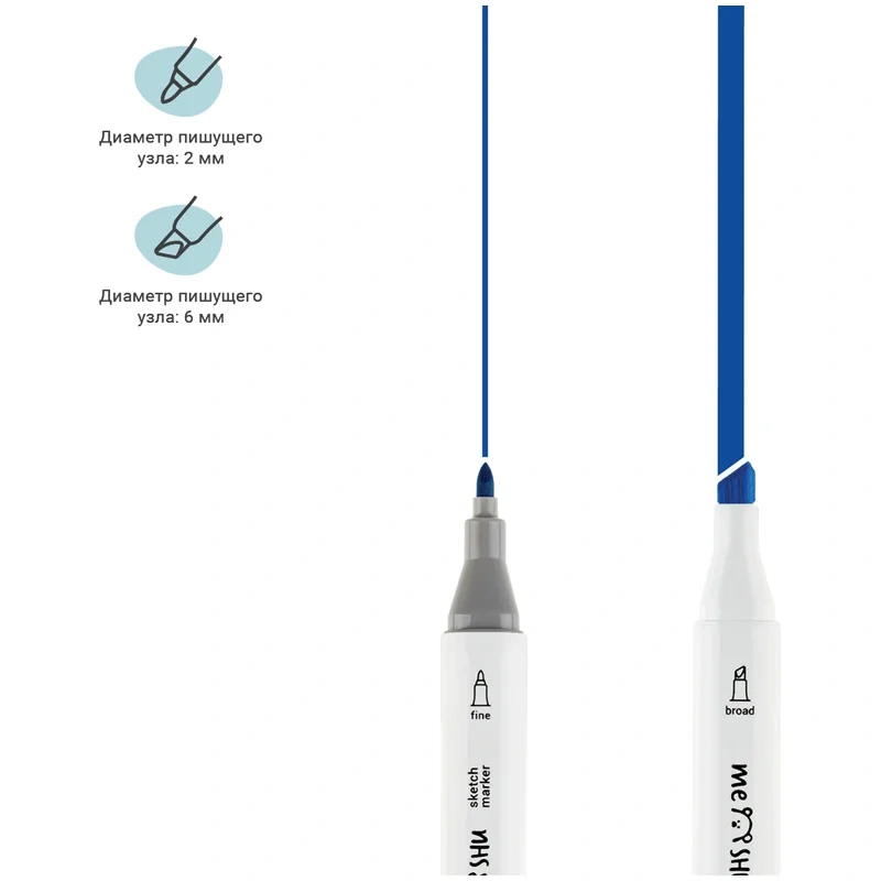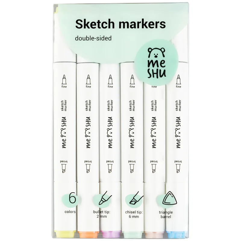 Набор двусторонних маркеров для скетчинга Meshu - идеальный выбор для художников, дизайнеров, иллюстраторов и любителей скетчинга, подходят для создания анимэ и манги. Эргономичный трехгранный корпус удобно лежит в руке и позволяет эффективно прорабатывать мелкие детали рисунка. Чернила на спиртовой основе - быстро высыхают, водостойкие, нетоксичны и не портят поверхность бумаги. Маркеры обладают пулевидным (2мм) и скошенным (6 мм) наконечниками, что позволяет прорабатывать как мелкие детали рисунка. так и закрашивать большие области.