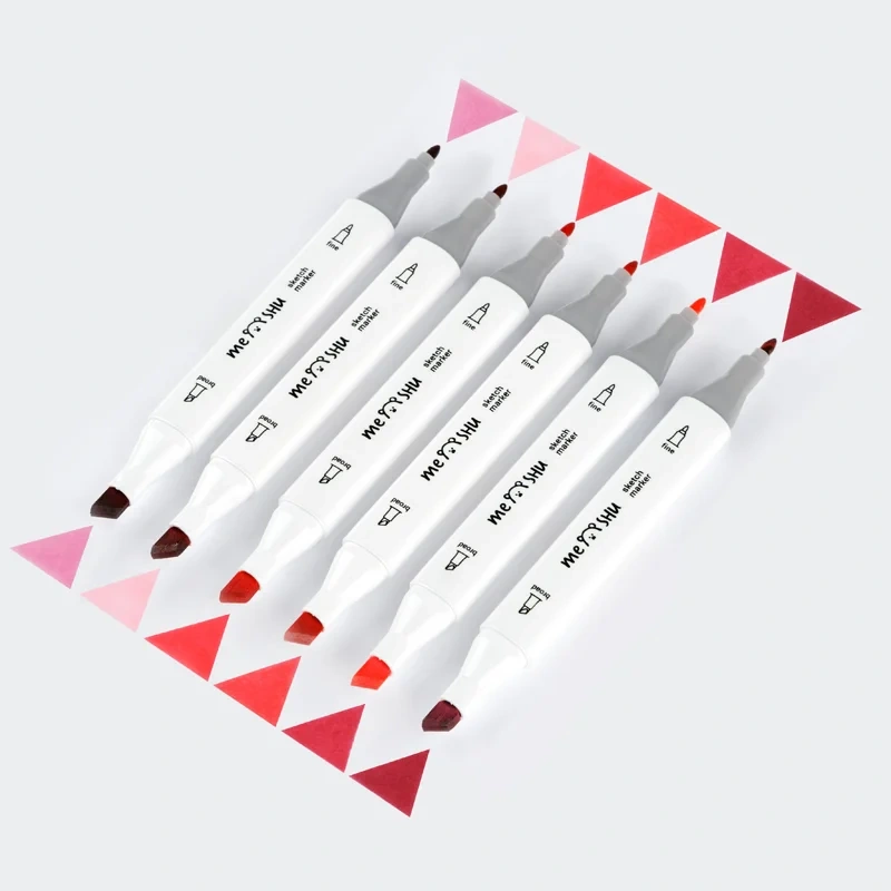 Набор двусторонних маркеров для скетчинга Meshu - идеальный выбор для художников, дизайнеров, иллюстраторов и любителей скетчинга, подходят для создания анимэ и манги. Эргономичный трехгранный корпус удобно лежит в руке и позволяет эффективно прорабатывать мелкие детали рисунка. Чернила на спиртовой основе - быстро высыхают, водостойкие, нетоксичны и не портят поверхность бумаги. Маркеры обладают пулевидным (2мм) и скошенным (6 мм) наконечниками, что позволяет прорабатывать как мелкие детали рисунка. так и закрашивать большие области.