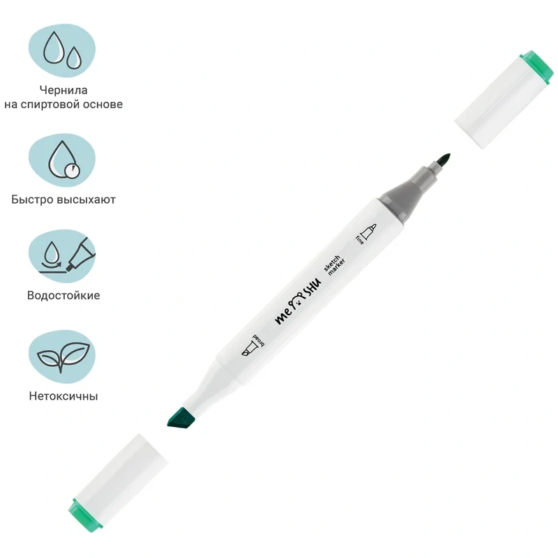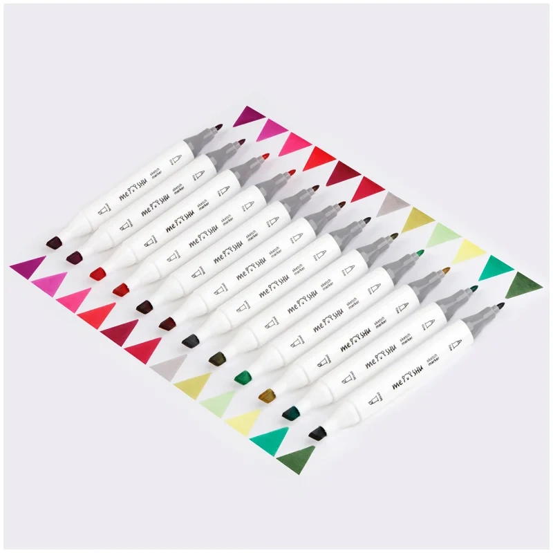 Набор двусторонних маркеров для скетчинга Meshu - идеальный выбор для художников, дизайнеров, иллюстраторов и любителей скетчинга, подходят для создания анимэ и манги. Эргономичный трехгранный корпус удобно лежит в руке и позволяет эффективно прорабатывать мелкие детали рисунка. Чернила на спиртовой основе - быстро высыхают, водостойкие, нетоксичны и не портят поверхность бумаги. Маркеры обладают пулевидным (2мм) и скошенным (6 мм) наконечниками, что позволяет прорабатывать как мелкие детали рисунка. так и закрашивать большие области.