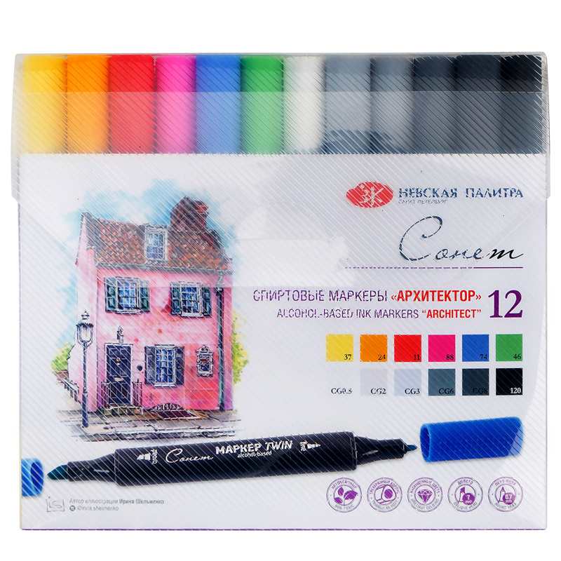 Спиртовые маркеры «Сонет» предназначены для всех видов скетчинга, а также сложных иллюстраций, комиксов и других творческих направлений. Два пера - пуля и долото универсальны для любой работы. Наконечник пуля идеален для тонких линий и точной детализации, долото - для быстрой визуализации и заполнения больших фрагментов. Палитра маркеров «Сонет» поштучно включает 110 цветов, в том числе блендер. Все цвета полупрозрачные, подойдут для создания лессировок и мягких цветовых переходов.Любой цвет можно приобрести отдельно, дополнив цветовую гамму набора.Для достижения наилучшего результата рекомендуем использовать альбом для маркеров «Сонет».Состав набора 'Архитектор':№37 - Пастельно-желтый,№24 - Медовый,№11 - Кармин,№88 - Сакура,№74 - Ярко-синий,№46 - Ярко-зеленый, №CG0.5 - Холодный серый 0,№CG2 - Холодный серый 2,№CG3 - Холодный серый 3,№CG6 - Холодный серый 6,№CG8 - Холодный серый 8,№120 - Черный.Упаковка набора - пластиковая коробка.Обязательной сертификации не подлежит.Срок годности - 2 года.