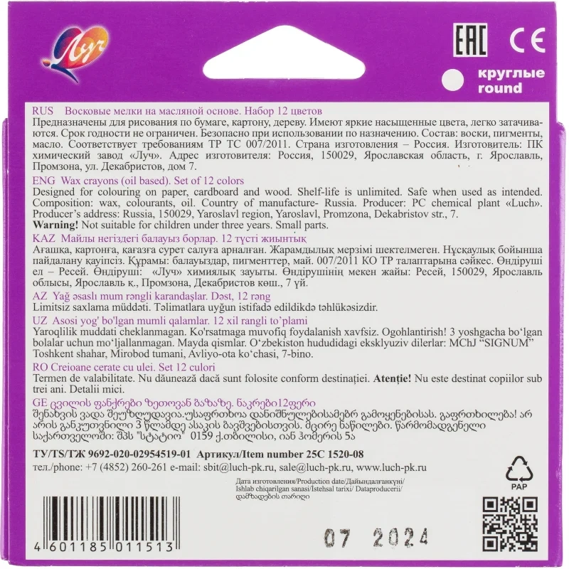 Мелки восковые Луч Фантазия круглые 12 цветов.
