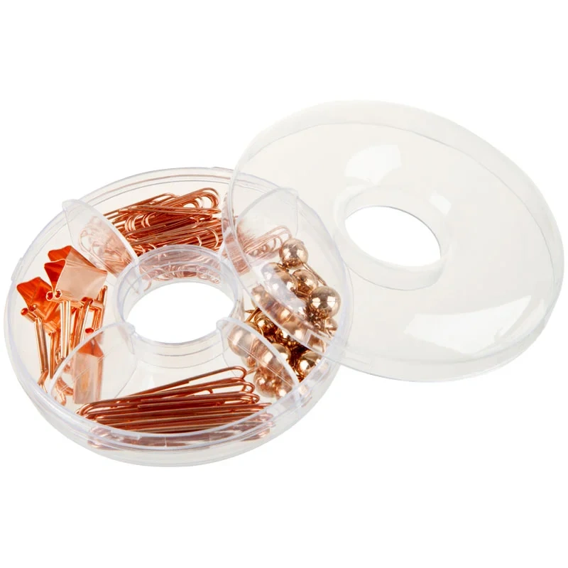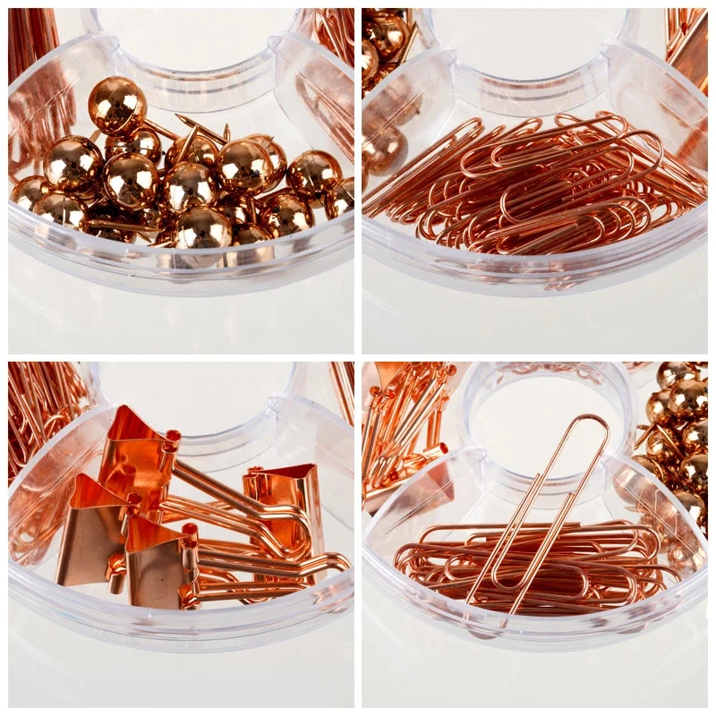 Набор канцелярских принадлежностей Meshu Rose Gold включает в себя: зажимы скрепки розовое золото 19 мм (4 штуки), скрепки розовое золото 28 мм (50 штук), скрепки скрепки розовое золото 50 мм (15 штук), силовые кнопки (20 штук). Все элементы упакованы в стильный пластиковый пенал с удобным замком и отделениями для каждого вида товара, который идеально подойдет для хранения принадлежностей. Упаковка набора - картонный подвес.