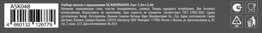 | Комплектация | миска - 2 шт.; крышка - 2 шт. |