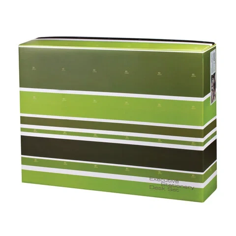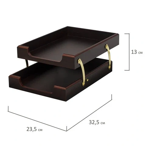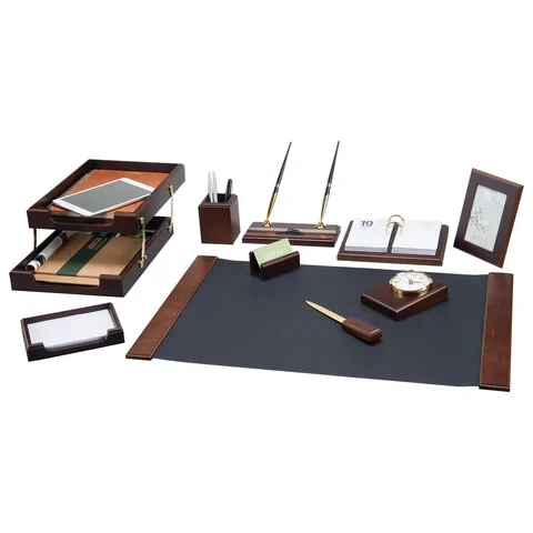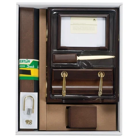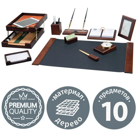 Все предметы изготовлены из дерева цвета 'орех' с золотистой фурнитурой. Набор упакован в подарочную коробку, а также дополнительно в защитный гофрокорб для транспортировки.