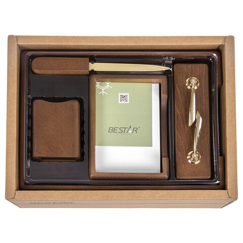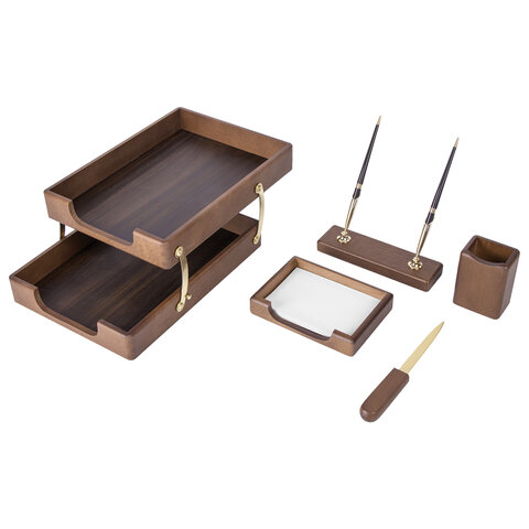 Набор состоит из 5 предметов: двойной лоток для бумаг, подставка для ручек (2 шариковые ручки в комплекте), стакан-подставка для письменных принадлежностей, подставка для бумажного блока, нож для вскрытия конвертов. Все предметы изготовлены из дерева цвета 'орех' с золотистой фурнитурой. Набор упакован в подарочную коробку.
