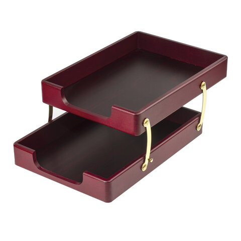 Набор состоит из 9 предметов: двойной лоток для бумаг, коврик для письма (размер - 66х43 см), подставка для ручек (2 шариковые ручки в комплекте), стакан-подставка для письменных принадлежностей, подставка для бумажного блока, подставка для визиток, нож для вскрытия конвертов, подставка для писем, скрепочница магнитная. Все предметы изготовлены из дерева красного цвета с золотистой фурнитурой. Набор упакован в подарочную коробку.