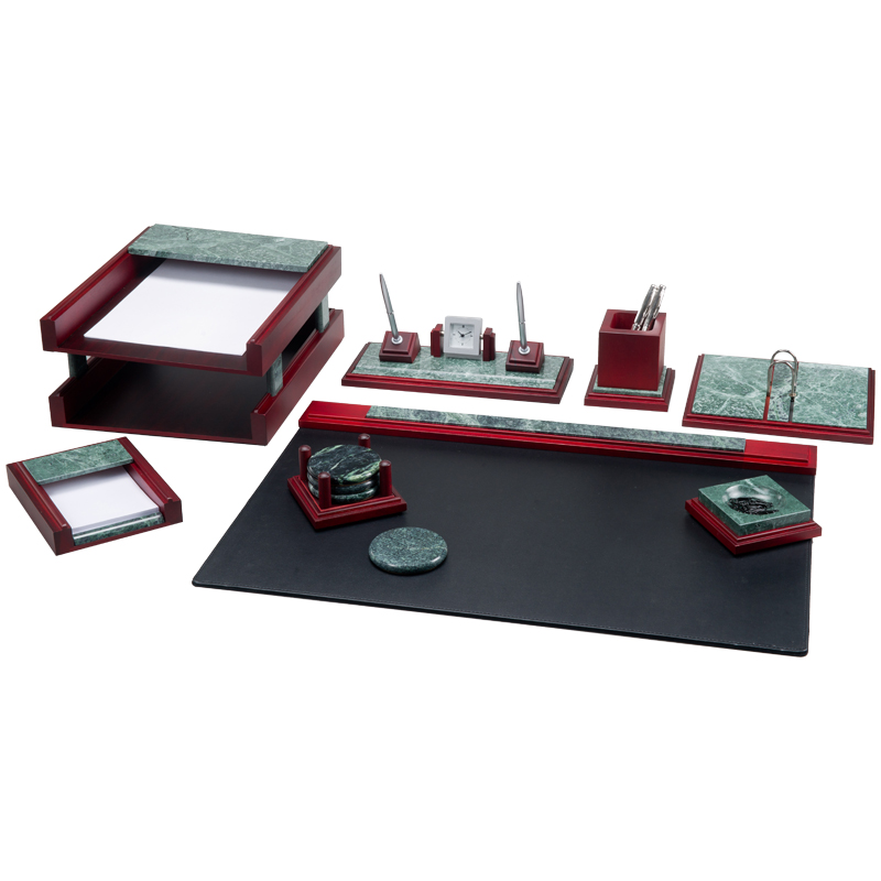 Предметы набора изготовлены из дерева и зеленого мрамора, цвет - красное дерево.
