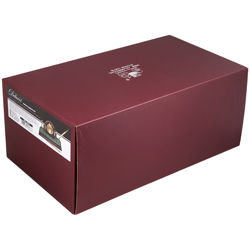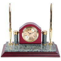Подставка Delucci в комплекте с ручкой из натурального зелёного мрамора и красного дерева. Часы с корпусом из красного дерева с двумя шариковыми ручками (чернила синего и чёрного цветов). Батарейки в комплекте.