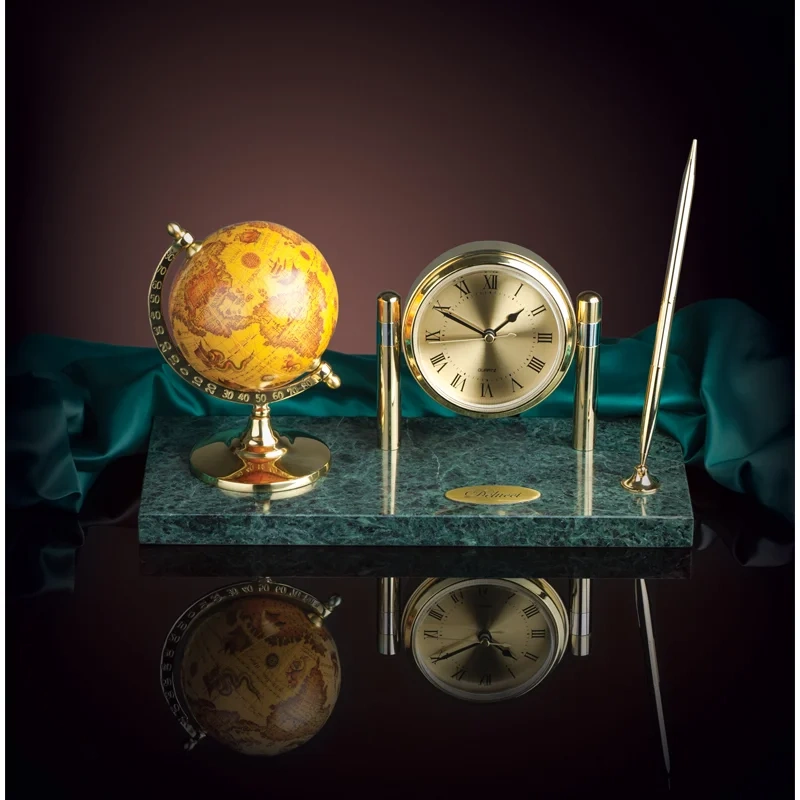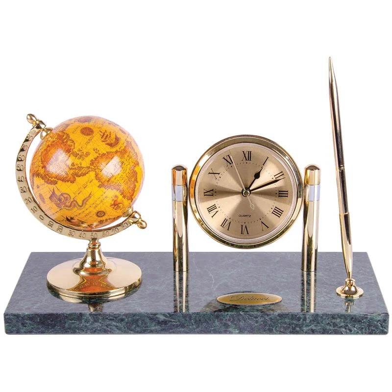 Элегантная подставка под ручку с глобусом и часами Delucci может стать замечательным украшением рабочего стола. Корпус выполнен из зелёного мрамора, а фурнитура – из прочного металла. Глобус диаметром 9 сантиметров и часы сделают подставку под ручку многофункциональной. В комплекте ручка с синими чернилами и батарейка. Подставка под ручку Delucci упакована в бордовую коробку.