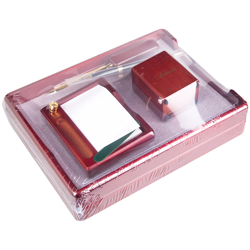 Наполнение: подставка для ручек, объединенная с подставкой для бумажных блоков и углублением для визитницы, подставка для карандашей, нож для открывания писем, двухуровневый лоток для бумаг. Цвет - красное дерево.