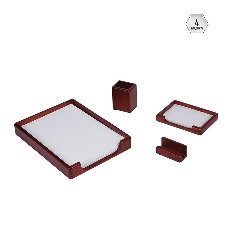 Набор из натурального дерева является идеальным подарком руководителю, украсит любой кабинет или офис. В состав входят: подставка для бумажного блока, подставка для визитных карточек, подставка для карандашей, лоток для бумаг.