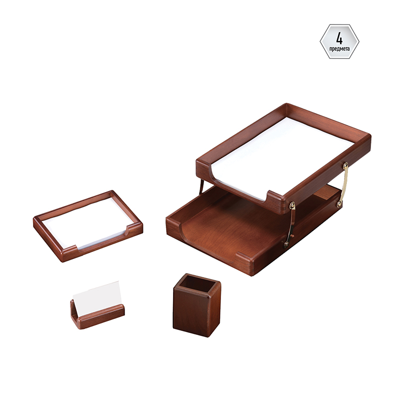 Набор из натурального дерева является идеальным подарком руководителю, украсит любой кабинет или офис. В состав входят: подставка для бумажного блока, подставка для визитных карточек, подставка для карандашей, двухуровневый лоток для бумаг.