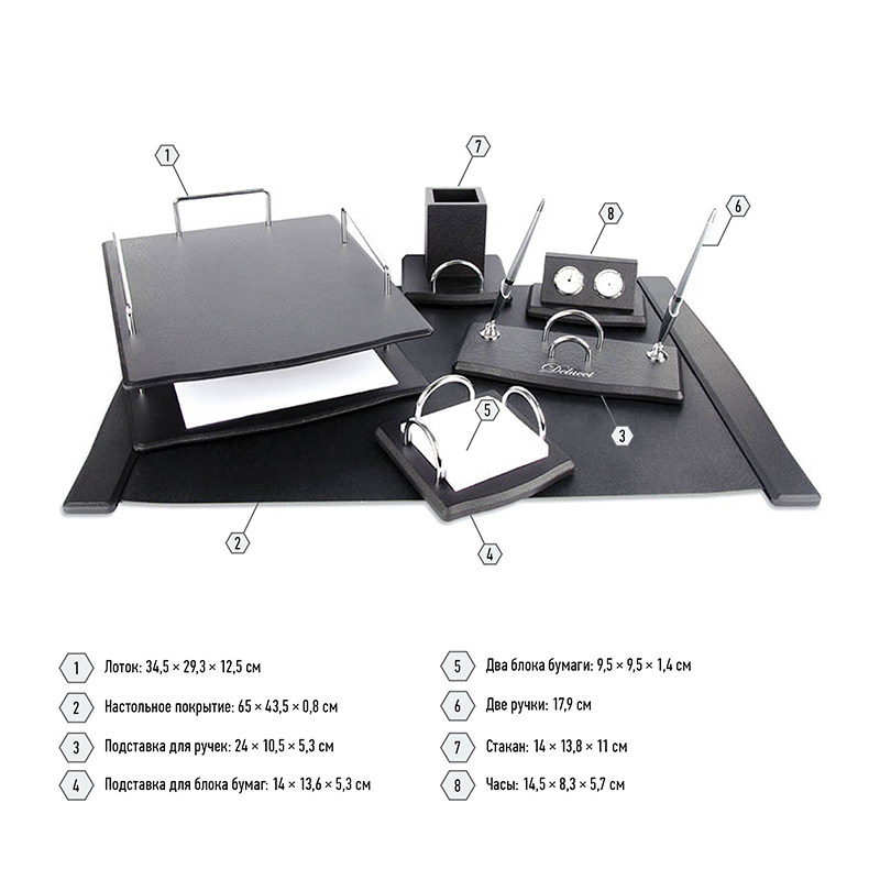 В состав набора входят: подкладка для письма, подставка для ручек (2 ручки в комплекте), подставка для бумажного блока, часы + термометр, двухуровневый лоток для бумаг, подставка для карандашей.