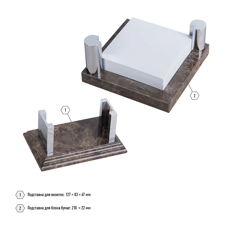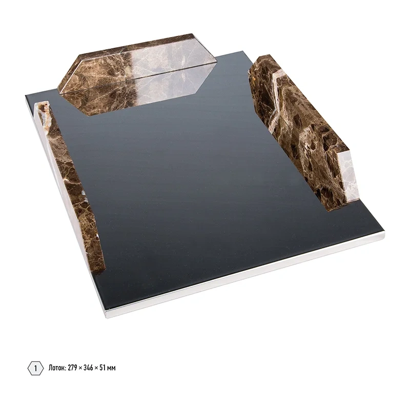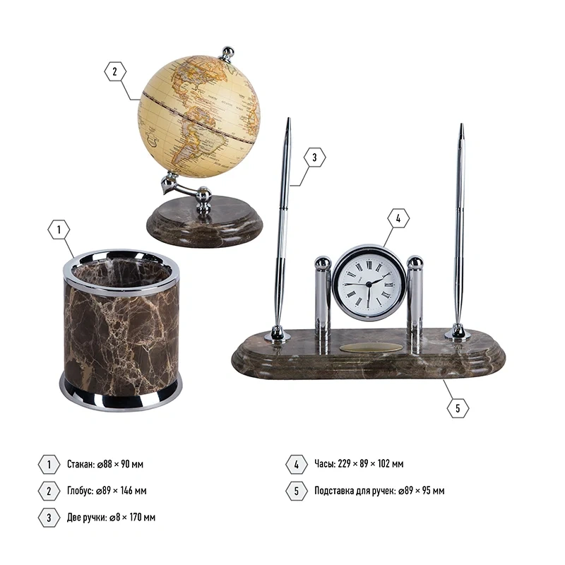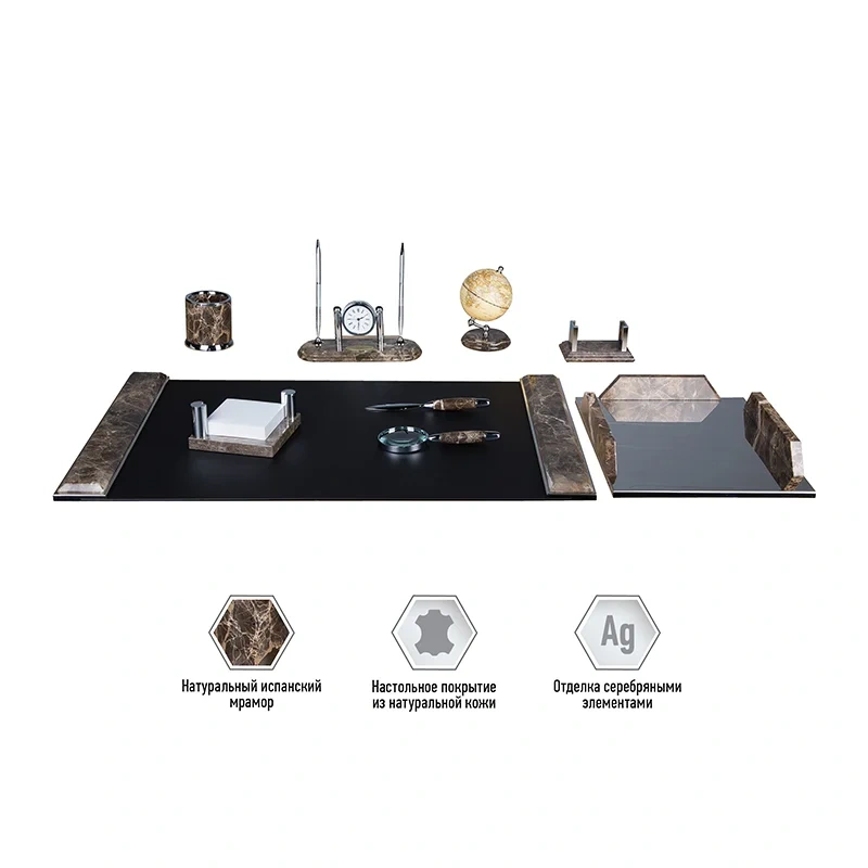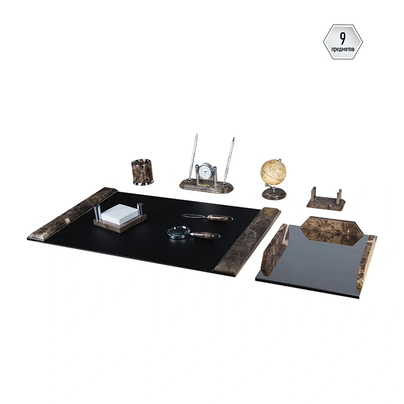 9 предметов с отделкой из коричневого мрамора. В настольный набор входят: настольное покрытие для письма из натуральной кожи, подставка для ручек, подставка для бумажного блока, подставка для визиток, подставка-стакан, лоток для бумаг, нож для открывания писем, лупа, часы, глобус. Материал - натуральный мрамор.