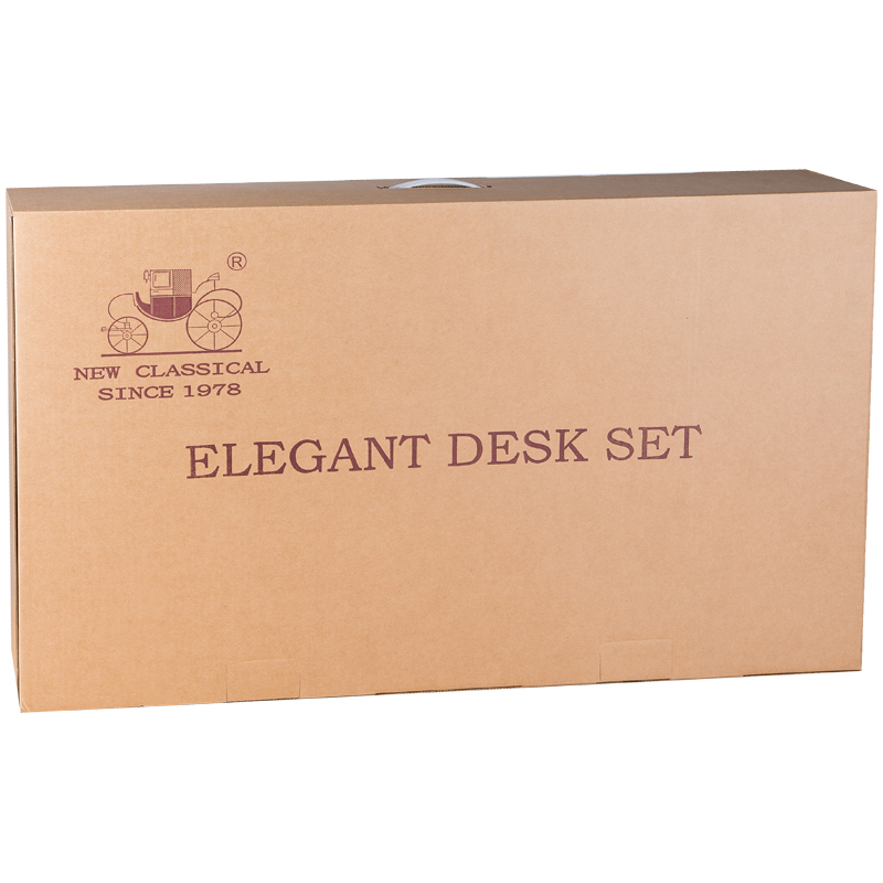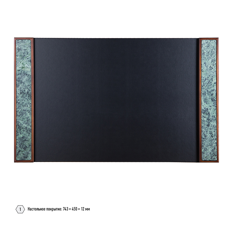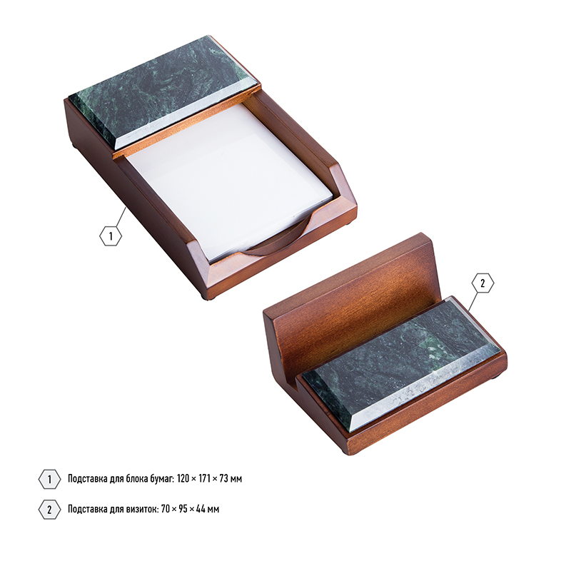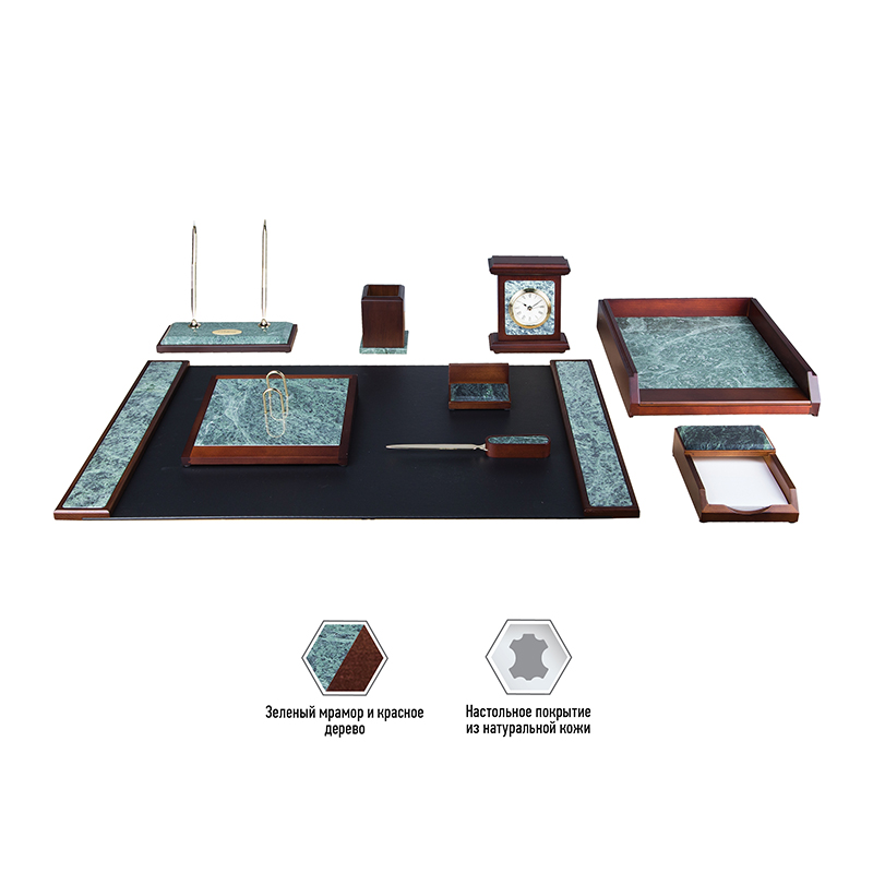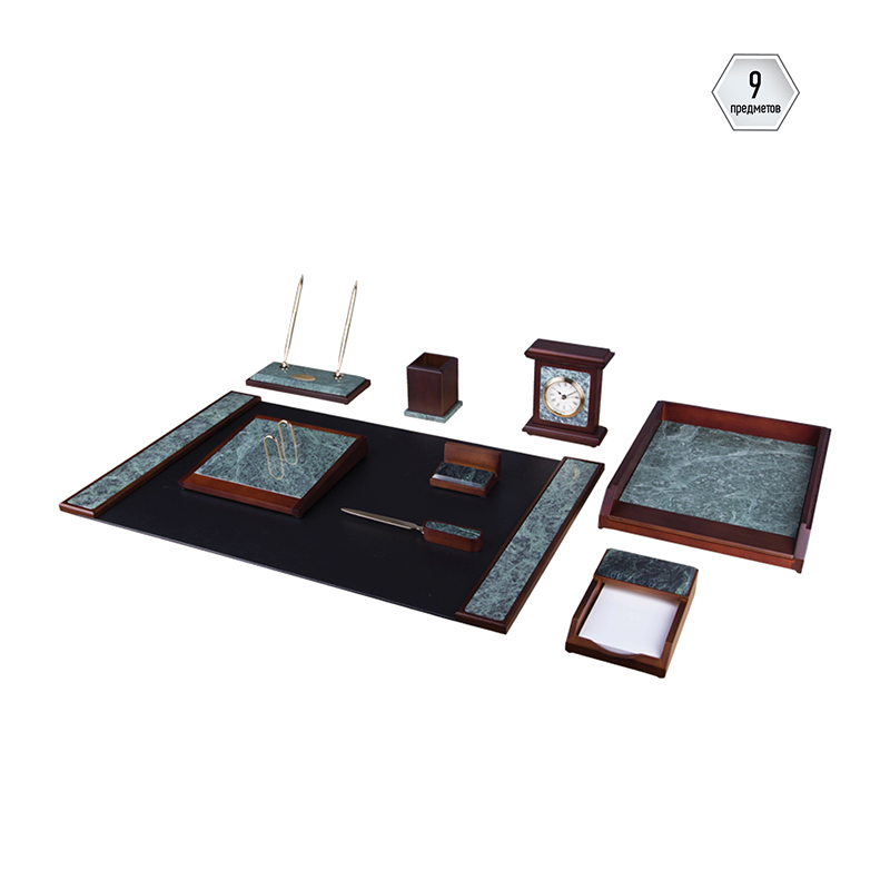 9 предметов с отделкой из зеленого мрамора и красного дерева. В настольный набор входят: настольное покрытие для письма из натуральной кожи, подставка для ручек, подставка для бумажного блока, подставка для визиток, подставка-стакан, лоток для бумаг, нож для открывания писем, часы, подставка под перекидной календарь. Материал - натуральный зеленый мрамор и дерево.