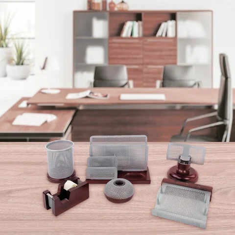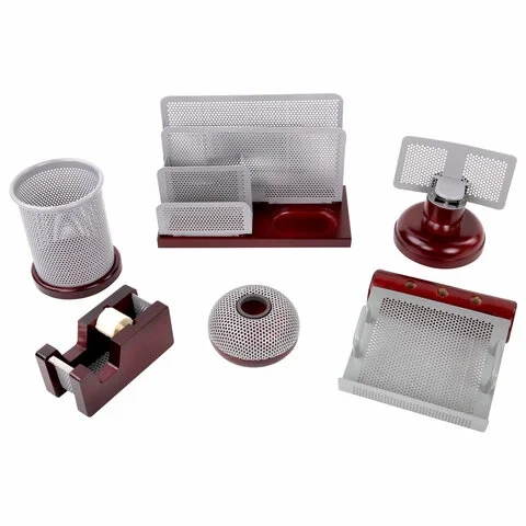 Настольный комплект изготовлен из красного дерева и качественного металла в современном стиле. Сетчатая структура придает роскоши. Изделие станет дополнением рабочего стола.