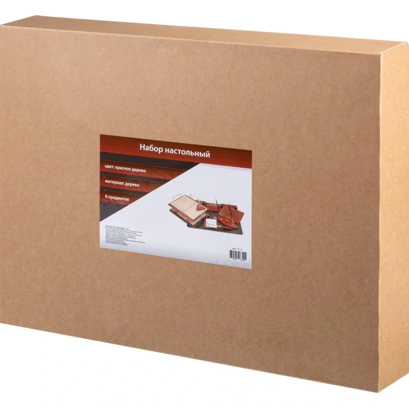 Набор настольный деревянный красное дерево (8 предметов). Набор настольный 8S-1A выполнен из красного дерева. Включает 8 предметов. Применяется для организации рабочего пространства на столе. Подходит для офиса и дома. Комплектация: 2-ярусный лоток для бумаг без смещения, бокс для бумаги, нож для вскрытия конвертов, подставка для визиток и шариковых ручек (2 ручки в комплекте, сменный стержень арт. 869006), подставка для конвертов, подставка для мелких бумаг, подставка для календаря, черный коврик на стол размером 50x40 см. Крепление универсальное для календаря любого типа. Удобство использования обеспечивает порядок и эстетичность на рабочем столе. Набор идеально подходит для создания комфортного рабочего места. Все предметы выполнены из качественного материала. Размеры набора соответствуют стандартам офисных аксессуаров. Упакован в картонную коробку. Набор внутри упакован в слюду. Идеально подходит для повышения эффективности работы и удобства хранения документов и канцелярских принадлежностей. Страна изготовления: Тайвань.