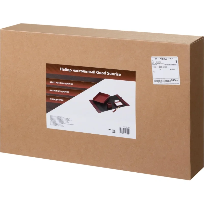 Комплектация: коврик настольный (дерево, ПВХ), подставка для канцелярских принадлежностей (дерево, пластик), нож канцелярский для вскрытия конвертов (дерево, металл), подставка для ручек и карандашей (дерево), лоток для бумаг одноярусный (дерево), ручка шариковая.