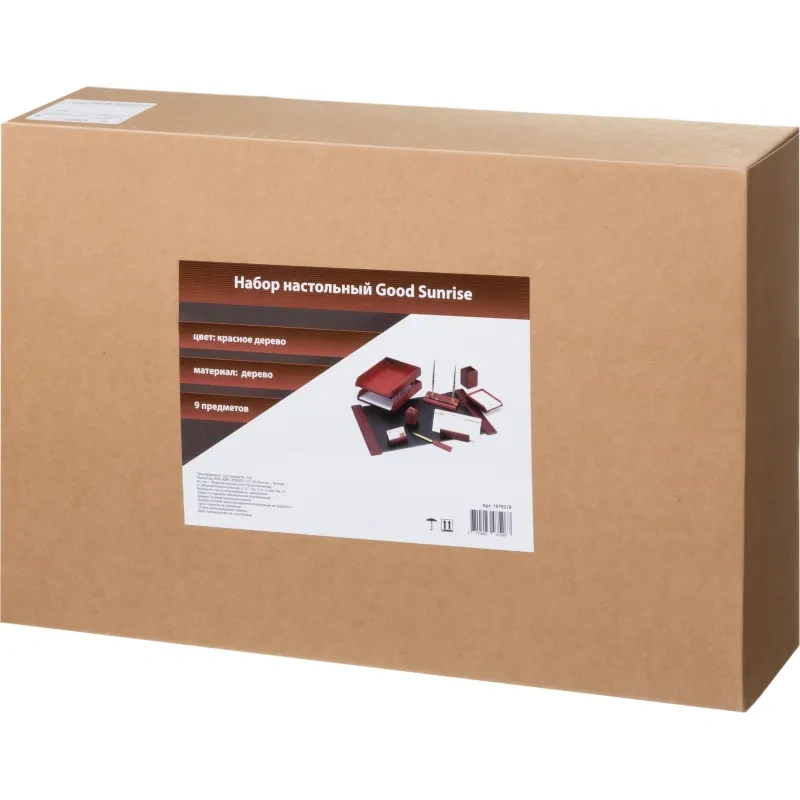 Комплектация: коврик настольный (дерево, ПВХ), подставка-держатель для ручек (дерево, металл, пластик), подставка для бумаг для заметок (дерево), подставка для визиток (дерево), подставка для ручек и карандашей (дерево), нож канцелярский для вскрытия конвертов (дерево, металл), подставка для писем (дерево), держатель-зажим (дерево), лоток для бумаг двухъярусный (дерево, металл), ручка шариковая (2 штуки).