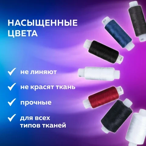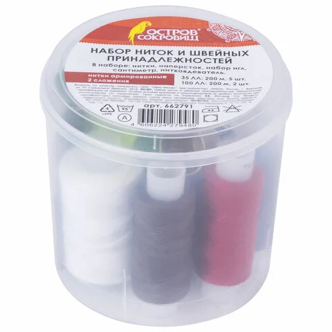 В набор входит 7 катушек армированных ниток в намотке 200 м стандартных цветов (толщина нити 100 ЛЛ - 2 штуки; 35 ЛЛ - 5 штук), иглы для ручного шитья разных размеров - 10 штук, сантиметр, наперсток, нитковдеватель. Поставляются в пластиковом прозрачном боксе с удобной крышкой. Материал состоит из прочной армированной нити.