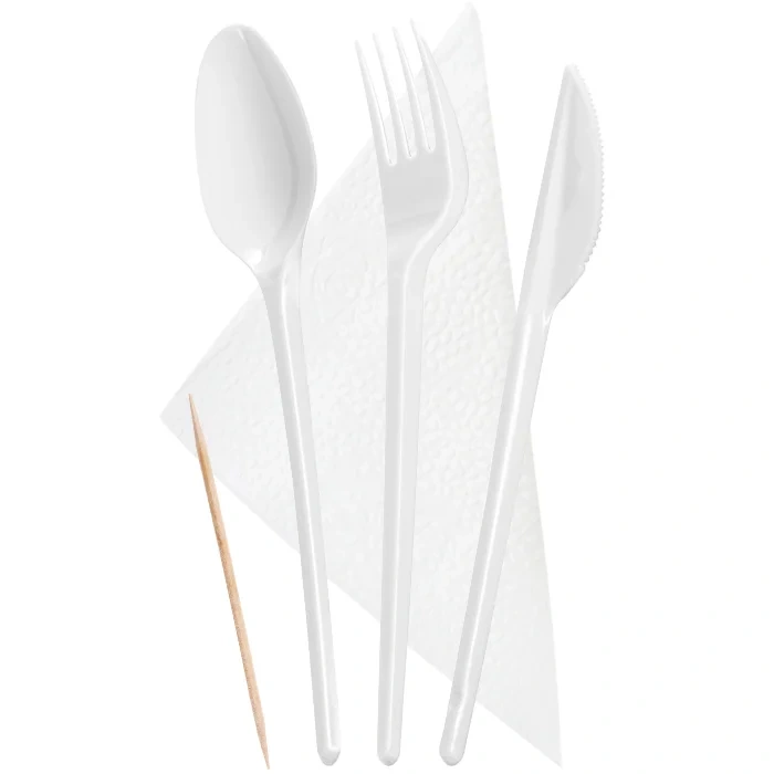 Набор состоит из вилки, столовой ложки, ножа, салфетки и зубочистки.