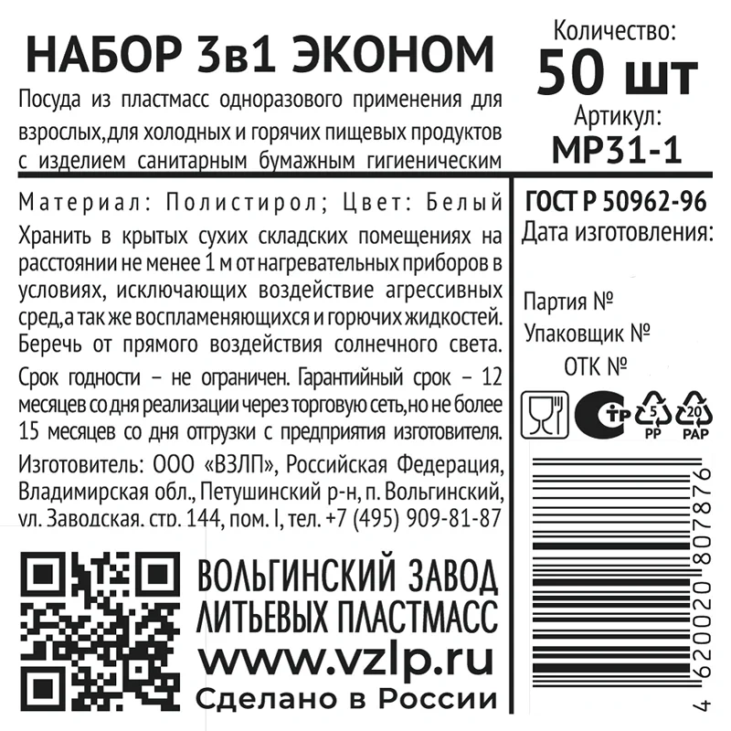 | Комплектация | набор одноразовой посуды - 50 шт. |