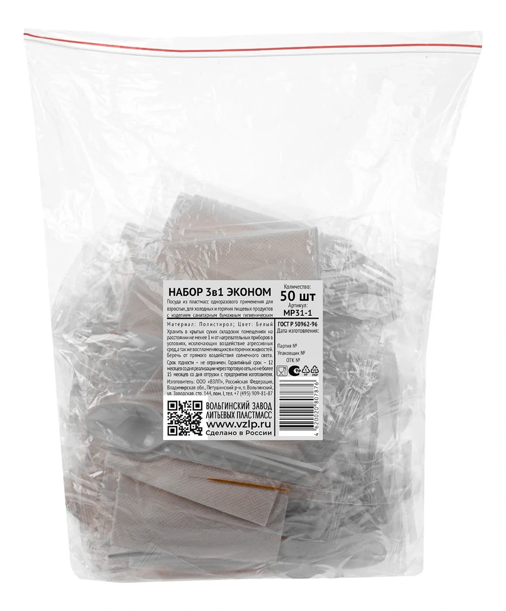 Набор одноразовых столовых приборов Vzlp Эконом 3в1 вилки + ложки + ножи + салфетки пластиковый белы