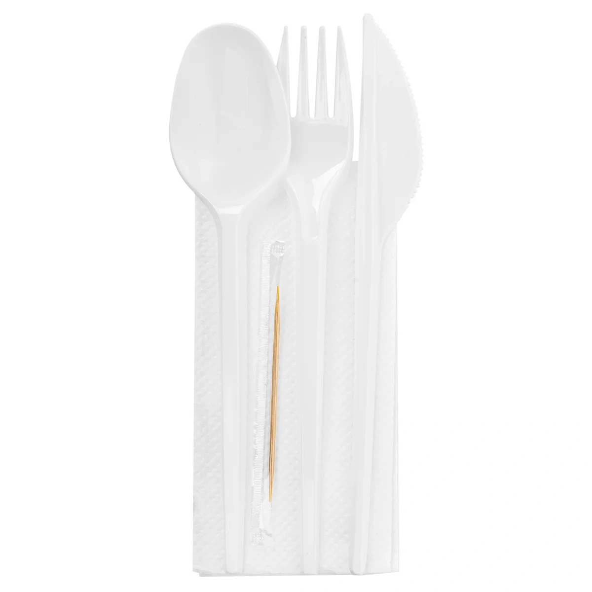 Набор столовых приборов состоит из: - Вилка столовая белая - 1 шт; - Ложка столовая белая - 1 шт; - Нож столовый белый - 1 шт; - Зубочистка в индивидуальной упаковке - 1 шт; - Салфетка одноразовая - 1 шт. Столовые приборы предназначены для употребления как охлажденных, так и горячих пищевых продуктов. Набор столовых приборов соответствует всем качественным стандартам.
