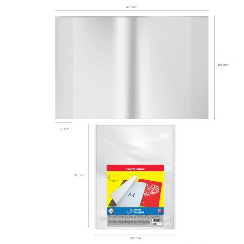 Обложка из высококачественного прозрачного пластика с особо прочными швами и текстурой поверхности 'Orange peel', на которой не видно отпечатков пальцев и мелких царапин. Надежно защищает тетради от повреждений. Гарантированно подходит для продукции ErichKrause.