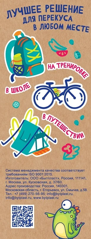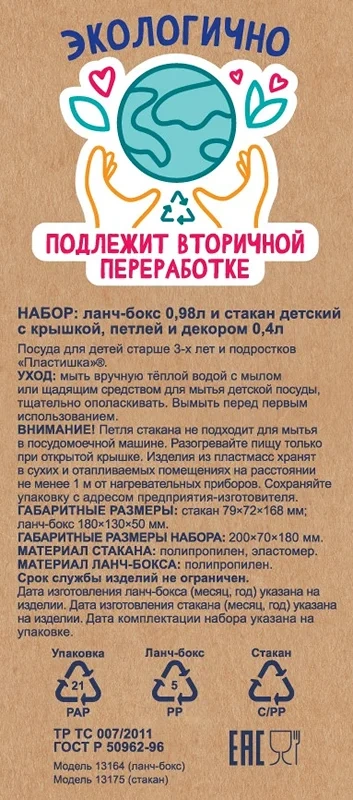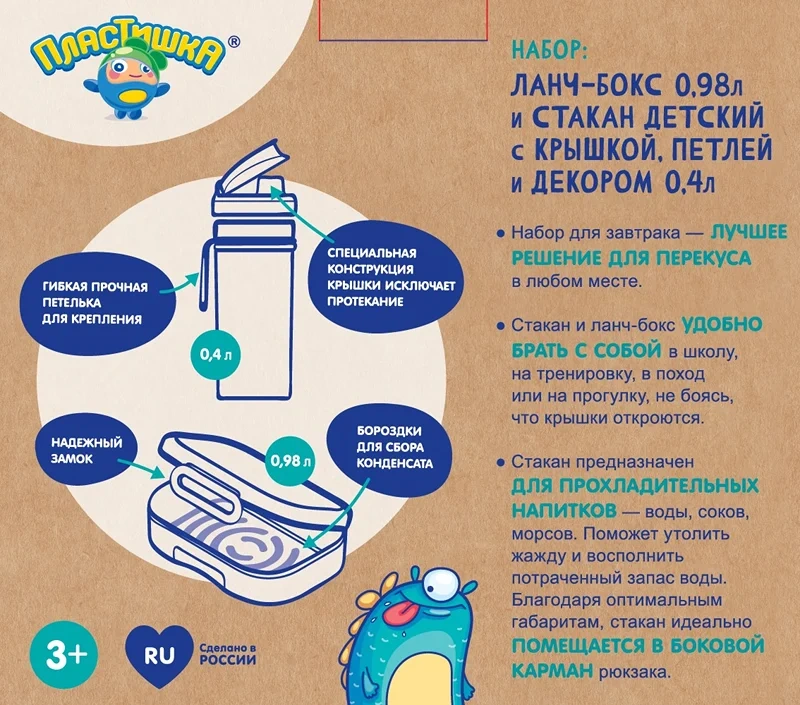 Набор для завтрака Пластишка - лучшее решение для перекуса в любом месте. Стакан и ланч-бокс удобно брать с собой в школу, на тренировку, в поход или на прогулку. Стакан предназначен для прохладительных напитков - воды, соков, морсов. Поможет утолить жажду и восполнить потраченный запас воды. Специальная конструкция крышки исключает протекание. Стакан имеет прочную гибкую петельку для удобства переноски. Благодаря оптимальным габаритам, идеально помещается в боковом кармане рюкзака. Благодаря надежному замку, наполненный ланч-бокс можно переносить не боясь, что крышка откроется. Дно контейнера с бороздками для сбора конденсата обеспечивает сохранность свойств приготовленного перекуса. Яркий декор нанесен с помощь. технологии IML, изображение не сотрется и не смоется с течением времени.