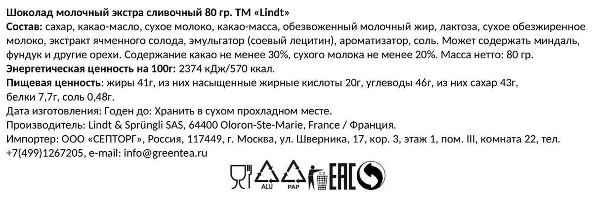 Шоколад темный с украшением Брусника и вишня - темный шоколад (какао тертое, сахар, масло какао, эмульгатор: соевый лецитин, натуральный ароматизатор ванильный), драже хрустящая матча (белый шоколад (сахар, масло какао, цельное сухое молоко, эмульгатор: соевый лецитин, натуральный ароматизатор ванильный), рис воздушный (крупа рисовая, мука пшеничная, сахар, соль), зеленый чай матча, комплексная пищевая добавка: глазирователь Квик Шайн, эфирное масло мяты), вишня сушеная, брусника сушеная.