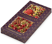 2. Шоколад молочный с украшением 'Пекан и брусника'. Внутри скрывается вкуснейший дуэт темного и молочного шоколада с добавлением клубники, брусники и экзотического пекана. Состав: молочный шоколад (сахар, масло какао, цельное сухое молоко, какао тертое, эмульгатор: соевый лецитин, натуральный ароматизатор ванильный), пекан обжаренный, брусника сушеная, семена тыквы обжаренные, воздушный рис в карамели.