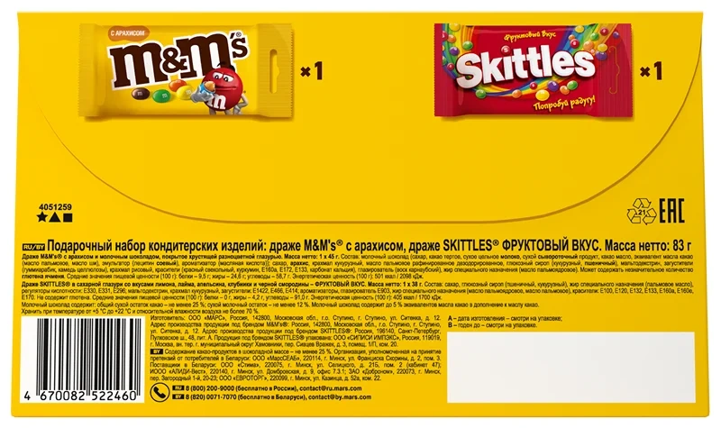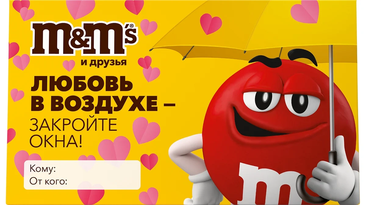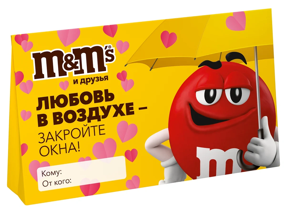 Подарочный набор M&M’S и друзья на 14 февраля и 8 марта в форме валентинки представляет собой сладкий подарок, предназначенный для выражения эмоций и приятных сюрпризов близким. В комплект входят популярные бренды - M&M'S и Skittles, а также изображения любимых героев и чуткие послания на упаковке. Такой подарок станет хорошим жестом на праздники и поможет подчеркнуть особое отношение.