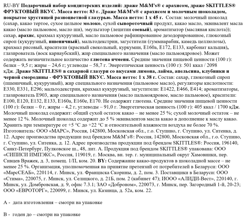 Драже M&M'S 45 г: молочный шоколад (сахар, какао тертое, сухое цельное молоко, сухой сывороточный продукт, какао масло, пальмовое масло, масло ши, соевый лецитин, ароматизатор), сахар, арахис, крахмал кукурузный, рафинированное пальмовое масло, глюкозный сироп, пшеничный мальтодекстрин, загустители гуммиарабик, камедь целлюлозы, крахмал рисовый, красители (свекольный свекла, куркумин, E160a, E172, E133), карбонат кальция, глазирователь - карнаубский воск, масло пальмоядровое.