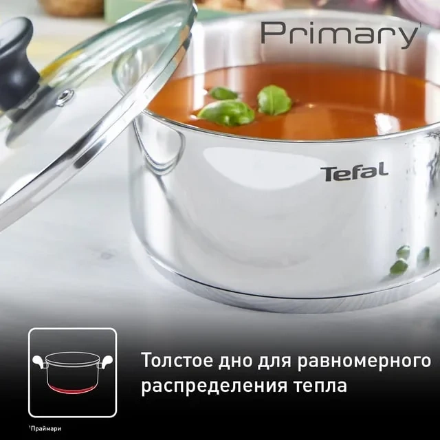 Набор кастрюль Primary Tefal 4 предмета — комплект высококачественной посуды из нержавеющей стали, который включает в себя: кастрюлю диаметром 20 см объемом 3 литра с крышкой и ковш диаметром 16 см и объемом 1,5 литра с крышкой. Изделия представлены в серебристом цвете — их зеркальная поверхность выглядит стильно, благодаря чему такие кастрюли гармонично вписываются в любой современный интерьер. Такой набор позволяет готовить даже самые сложные блюда, а процесс приготовления не займет много времени и вызовет только положительные эмоции. Нержавеющая сталь — материал с высокой теплопроводностью, который быстро нагревается, равномерно распределяет жар и долго сохраняет тепло. Конструкция посуды Tefal продумана до мелочей. На внутренней поверхности кастрюли и ковша нанесена мерная шкала, позволяющая точно отмерять уровень жидкости. Дополнительно каждое изделие оснащено специальным носиком для слива жидкости без брызг. Крышки из высокопрочного стекла позволяют следить за процессом приготовления.