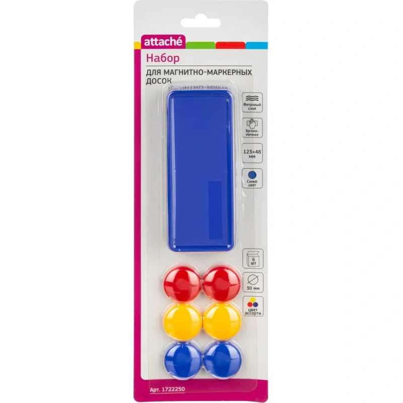Набор принадл.для магн-марк. досок Attache(синяя губка,магниты 30мм,ассорт) Набор для магнитно-маркерных досок Attache состоит из: губки-стирателя, 6 магнитных держателей. Губка предназначена для стирания маркеров с магнитно-маркерных досок сухим способом. Магнитные держатели для досок предназначены для фиксирования информации на металлических поверхностях магнитно-маркерных досок, флипчартов или витрин. Диаметр 30 мм. Цвет губки синий, цвет магнитов в ассортименте.