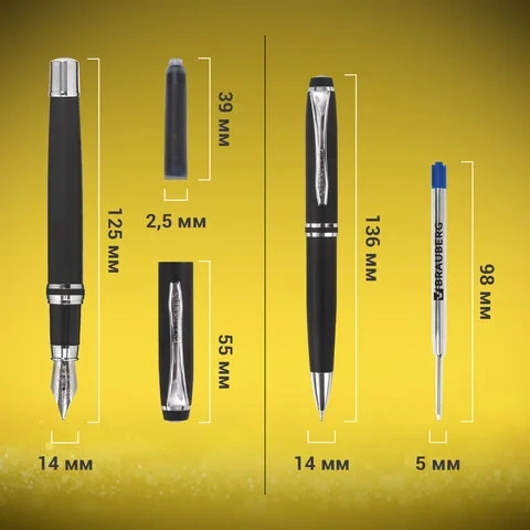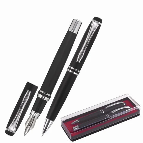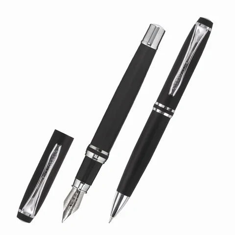 В набор ручек бизнес-класса входят: стильные модели перьевой и шариковой ручек с корпусом из металла черного цвета и серебристыми деталями. Синий цвет чернил. Диаметр пишущего узла шариковой ручки 1,0 мм создает ровню линию письма, равную 0,5 мм. Диаметр пишущего узла перьевой ручки 0,5 мм создает ровню линию письма, равную 0,25 мм. Поставляется в фирменной упаковке.