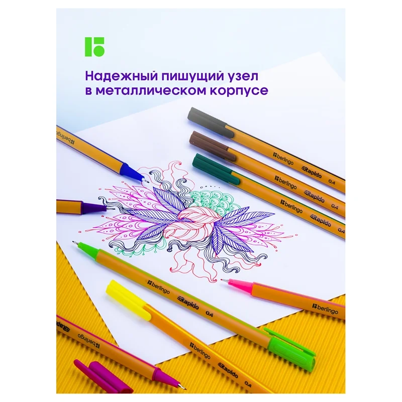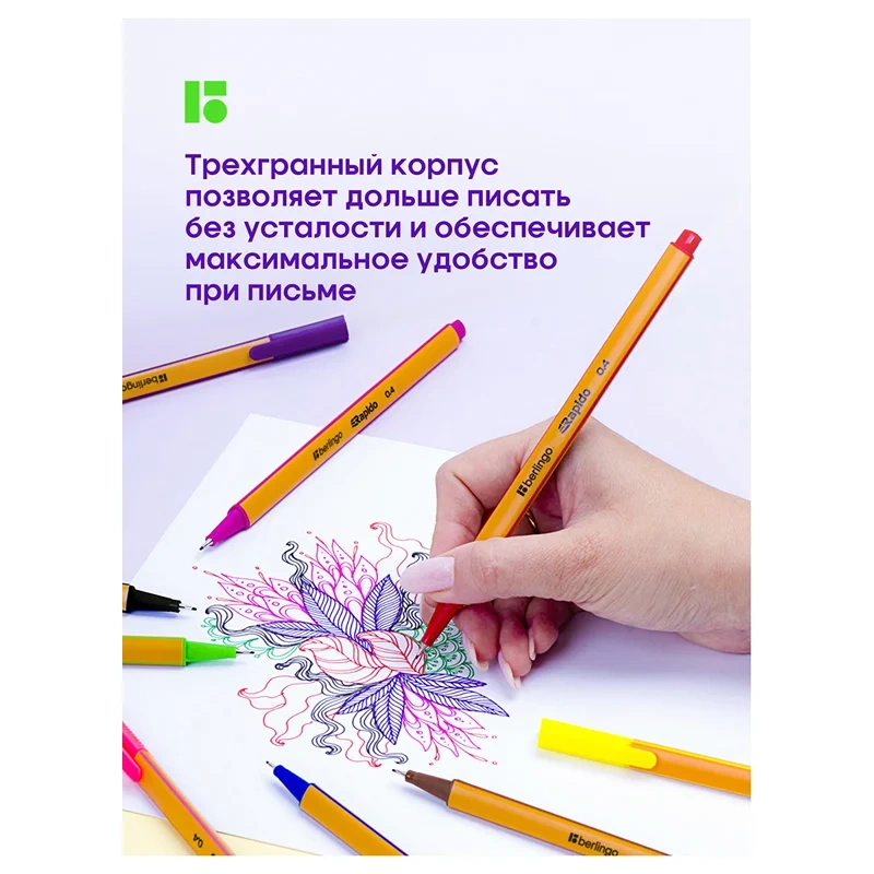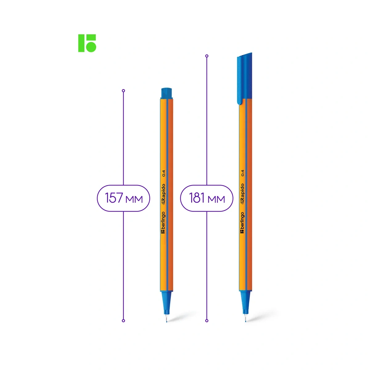 Набор капиллярных ручек Berlingo Rapido состоит из 10 ярких цветов. Каждое изделие в наборе обеспечивает особо лёгкое, мягкое и точное письмо, которое идеально подходит для рисования и черчения. Ручка обладает эргономичным трёхгранным корпусом, благодаря которому ими максимально комфортно пользоваться. Металлическое обжатие наконечника дает возможность работать с линейками и трафаретами. Высокое качество износостойкого пишущего наконечника и большой запас чернил значительно увеличивают срок службы ручки до 48 месяцев. Также, ручка долгое время не утрачивает пишущих свойств без колпачка. Чернила на водной основе. Цвет колпачка соответствует цвету чернил. Толщина линии 0,4 мм.