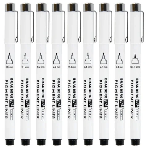 В наборе 9 черных капиллярных ручек с типами наконечников 'Линер': № 0.05, 0.1, 0.2, 0.3, 0.4, 0.5, 0.7, 0.8 - номер ручки на колпачке соответствует толщине линии письма в миллиметрах; 'Кисть': № BR - 1 мм - за счет длины и упругости наконечника 'кисть' толщина линии письма может варьироваться от 0.1 до 2 мм.