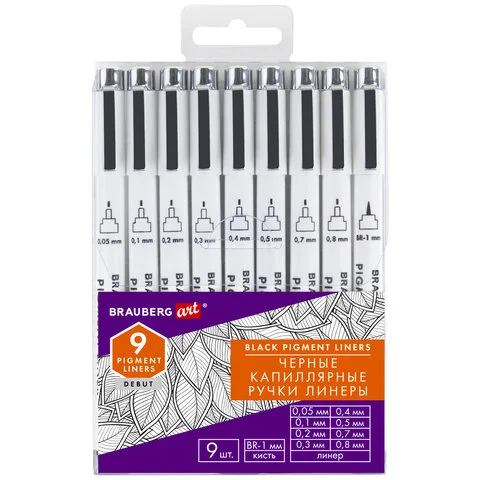 Набор ручек капиллярных Brauberg ART DEBUT черные, 0.05-0.8мм, кисть S, 9шт/уп