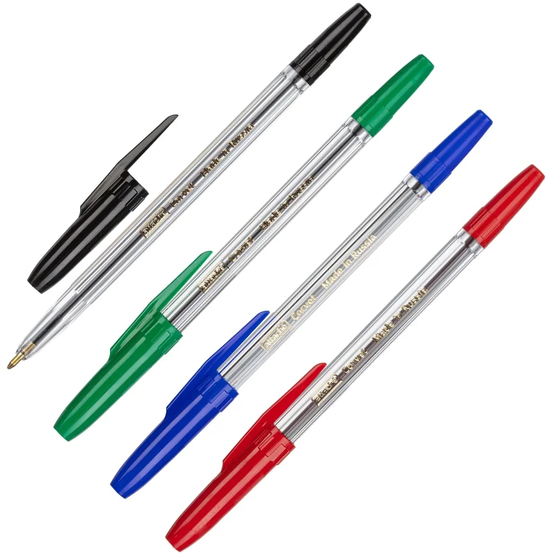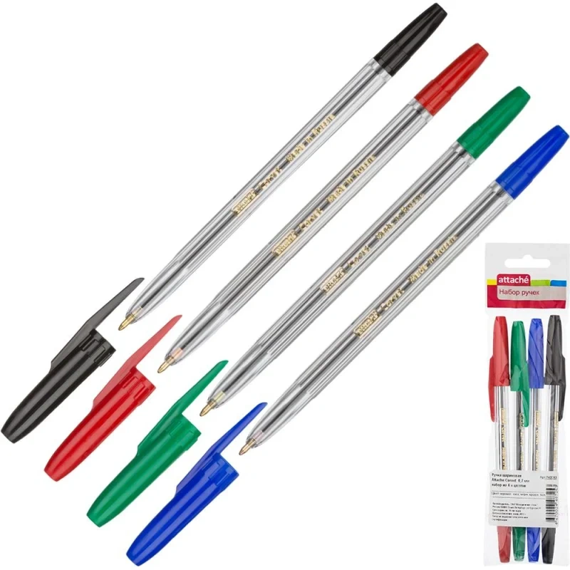 Набор шариковых ручек Attache Corvet 4 цвета (синий, черный, красный, зеленый). Модель ручек представлена в пластиковом прозрачном корпусе, снабжена вентилируемым колпачком. Цвета заглушки и колпачка соответствуют цвету чернил. Сменный стержень длиной 152 мм имеет стандартный наконечник заправлен высококачественными чернилами. Встроенный шарик диаметром 1 мм создает тонкую линию письма, равную 0,7 мм. Упакован в пакет ВОРР с европодвесом.
