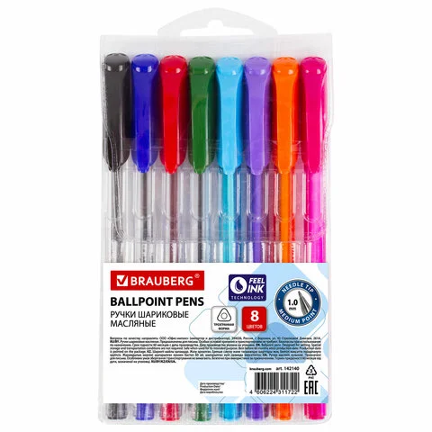 Набор шариковых ручек Brauberg Extra Glide 8 цветов, 0.5мм, 8шт/уп, прозрачный корпус, одноразовые