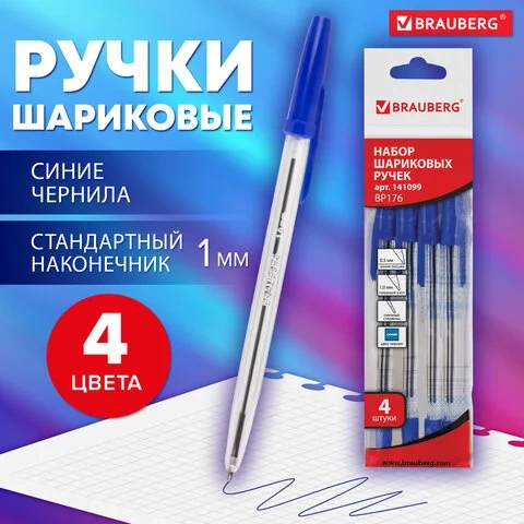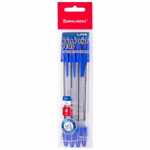 Набор шариковых ручек Brauberg Line синие, 1мм, 4шт/уп, прозрачный корпус, 141099