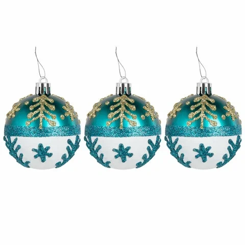 3 шара бирюзового и белого цвета с золотым рисунком с матовым эффектом (диаметром 6 см),