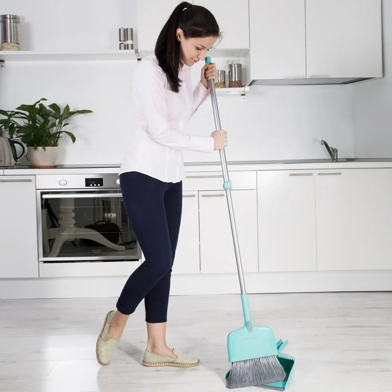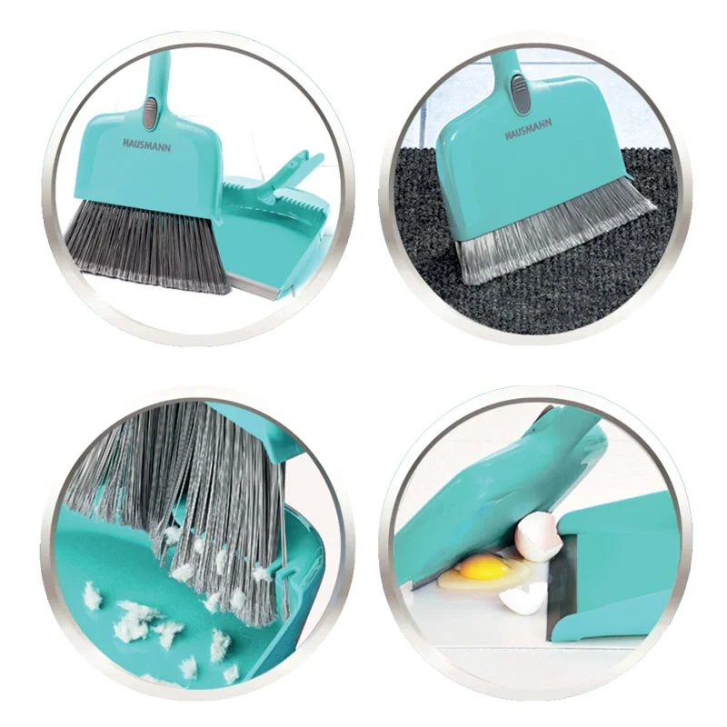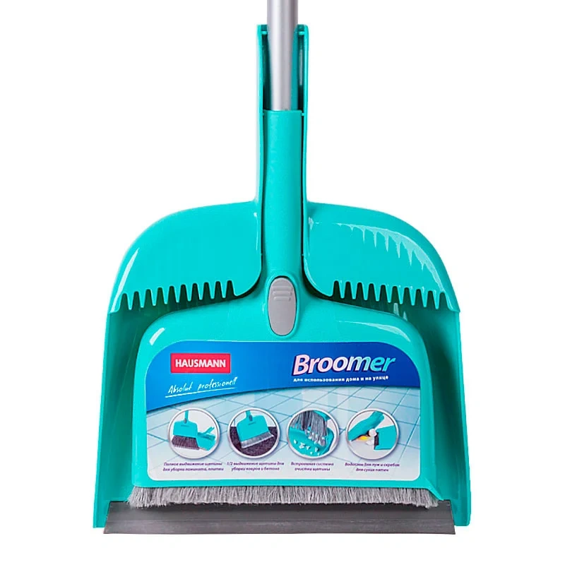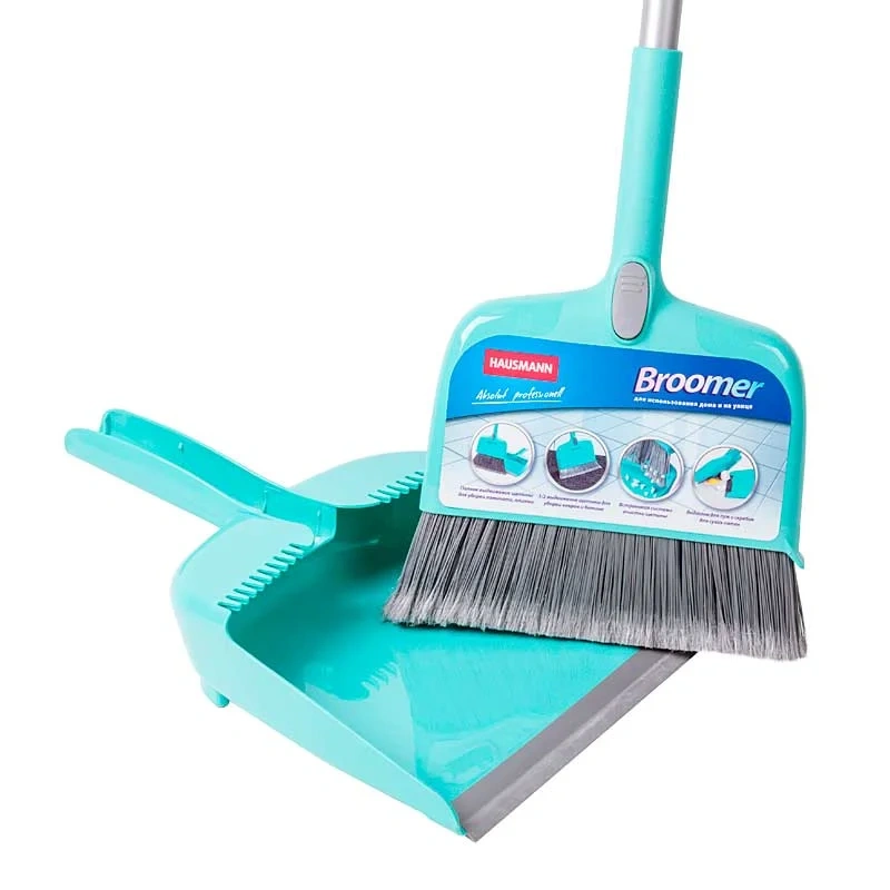 Набор: щетка, совок для сухой уборки, длина 132см Hausmann HM-00220 Broomer с фиксатором для совка на щетке можно оставить в любом удобном месте, оперев о стену, а также просто положить на пол. Телескопическая ручка швабры удлиняется и фиксируется с помощью фиксатора, что позволяет установить ее на нужном уровне и достать даже до самых труднодоступных мест. Загребающая щетина скрывается под специальным защитным футляром и выходит наружу при нажатии кнопки. Ворсинки расположены рядом друг с другом под углом 30 градусов, что позволяет эффективно убирать даже самый мелкий мусор, шерсть животных и пыль. Щетку можно использовать для очистки загрязнений на гладких и ворсистых поверхностях. При выдвижении щетинок на всю длину удаляются загрязнения с гладких поверхностей, а при ограничении на ? эффективно очищается поверхность ковров и бетона. Водосгон на щетке позволяет быстро убрать жидкость. Совок имеет удобную форму и специальную прорезиненную ленту со стороны сбора мусора, что позволяет установить его под любым удобным углом. Со стороны ручки на совке есть гребенчатый захват, который позволяет эффективно убрать волосы, шерсть и другой мусор с щетки. Для производства совка использован прочный и долговечный пластик. Срок использования комплекта не ограничен.