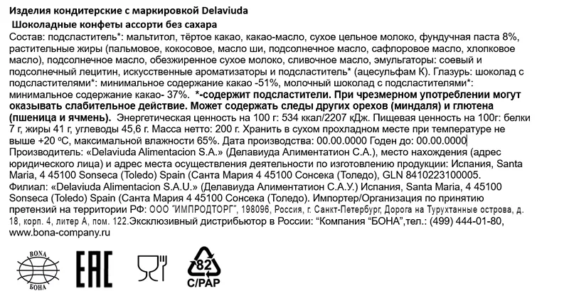 Набор шоколадных конфет Delaviuda Ассорти без сахара, 200г