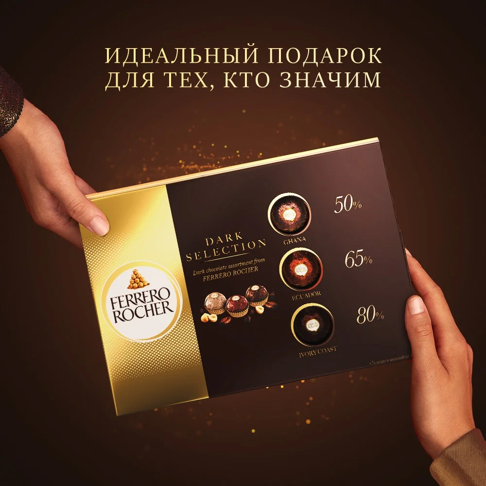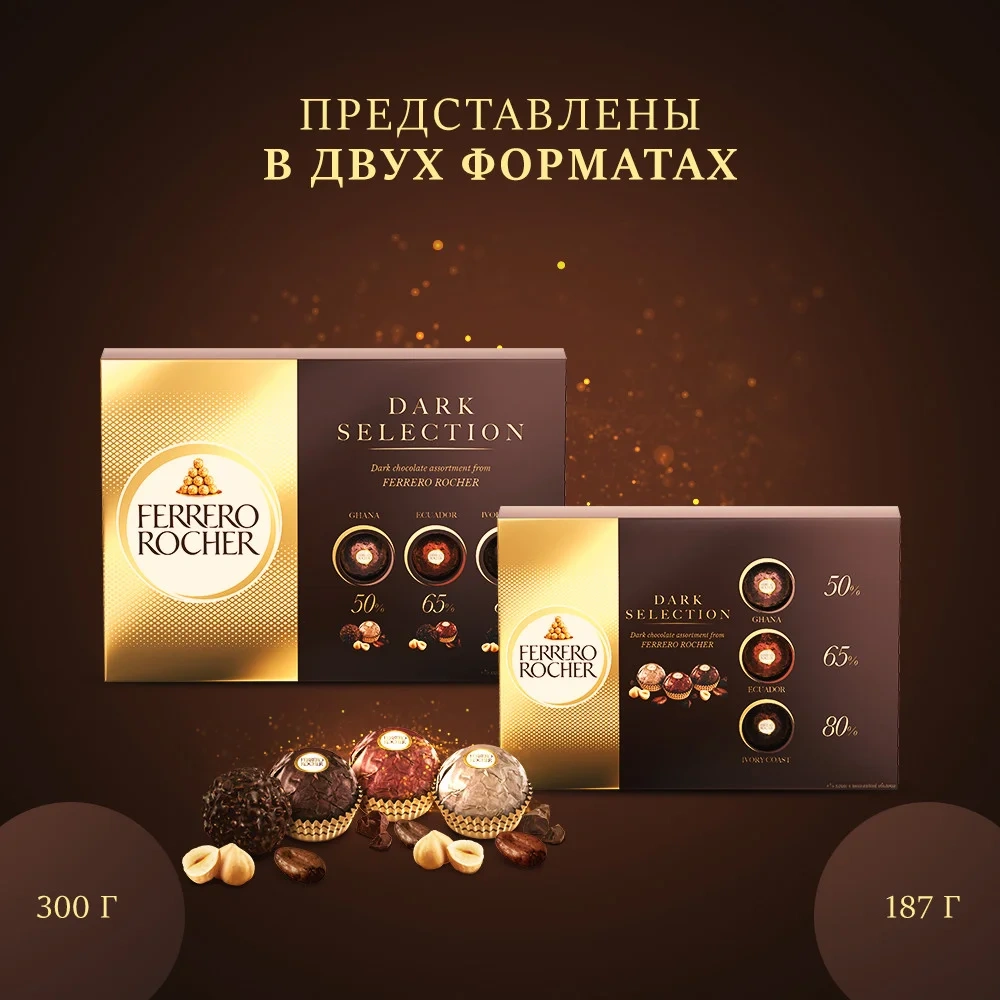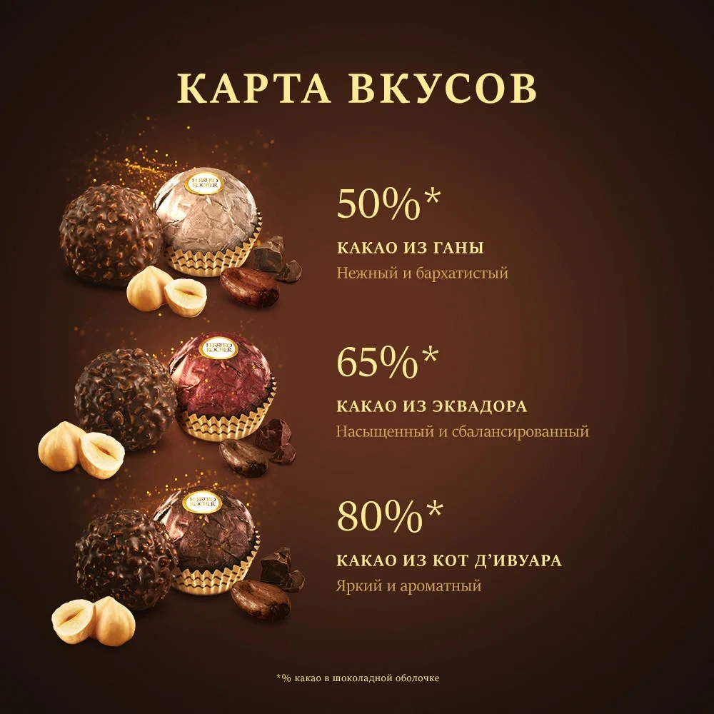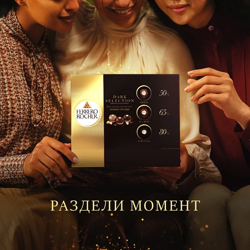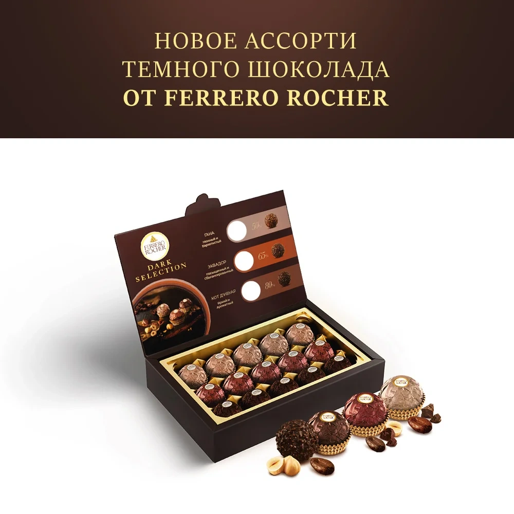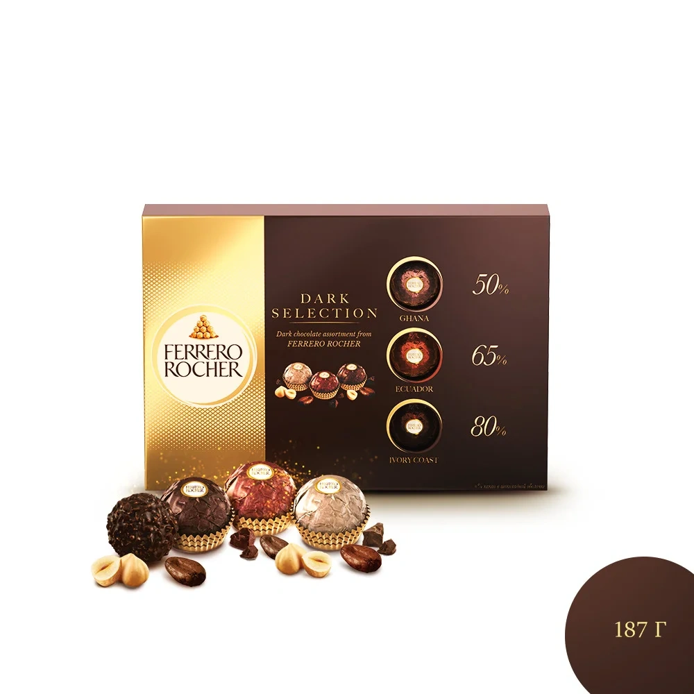 Опыт Ferrero позволил создать Ferrero Collection (Ферреро Коллекшн) - изысканное ассорти из лучших продуктов компании. Rocher: сочетание цельного фундука, покрытого восхитительным сливочно-ореховым кремом, и хрустящей вафельной оболочки с шоколадом подарит вам неповторимые вкусовые ощущения. Raffaello: гармоничное сочетание тщательно отобранных ингредиентов: выращенных на островах Тихого океана кокосов и калифорнийского белого миндаля. Rondnoir: яркий вкус хрустящей оболочки из черного шоколада со сливочно-шоколадной начинкой и жемчужины темного шоколада в центре.